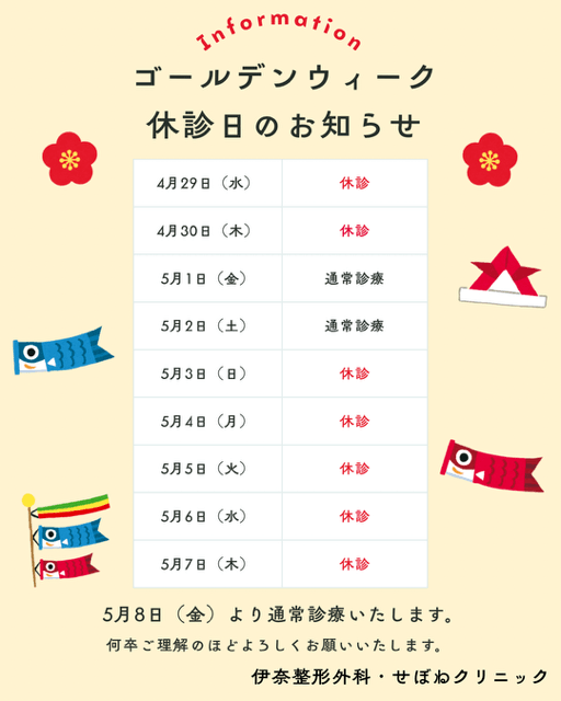 - ゴールデンウイーク期間中の診療はカレンダー通りとなります。
